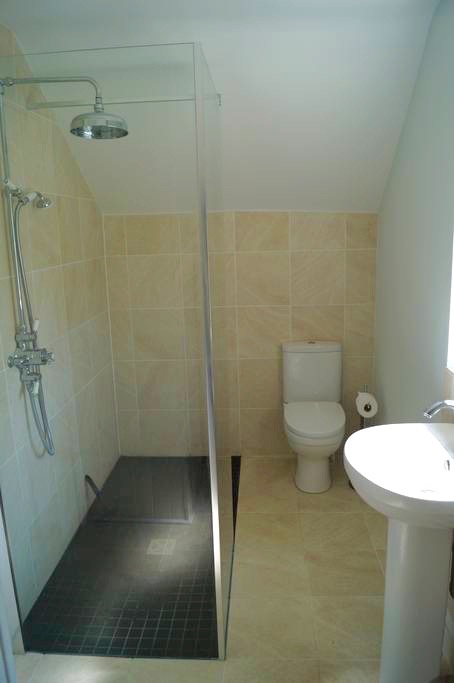 Through the bedroom is a wet-room with basin and toilet. Towels are provided for use at the Coachhouse. The bathroom has a window overlooking the patio, an extractor fan and heater.