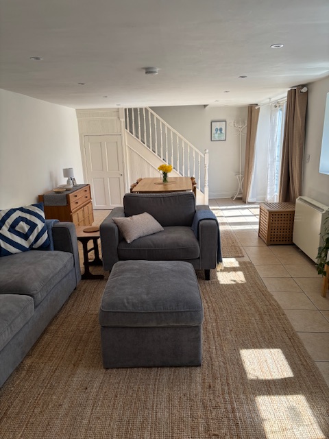 The entire cottage has been recently decorated and features art and artefacts from Thanet’s thriving creative scene. Further into the living area is space for relaxing with a sofa-bed, coffee table, TV and DVD. The sofa is easily converted to a comfortable double sofa bed which can accommodate more guests and has storage for linen in the foot rest.